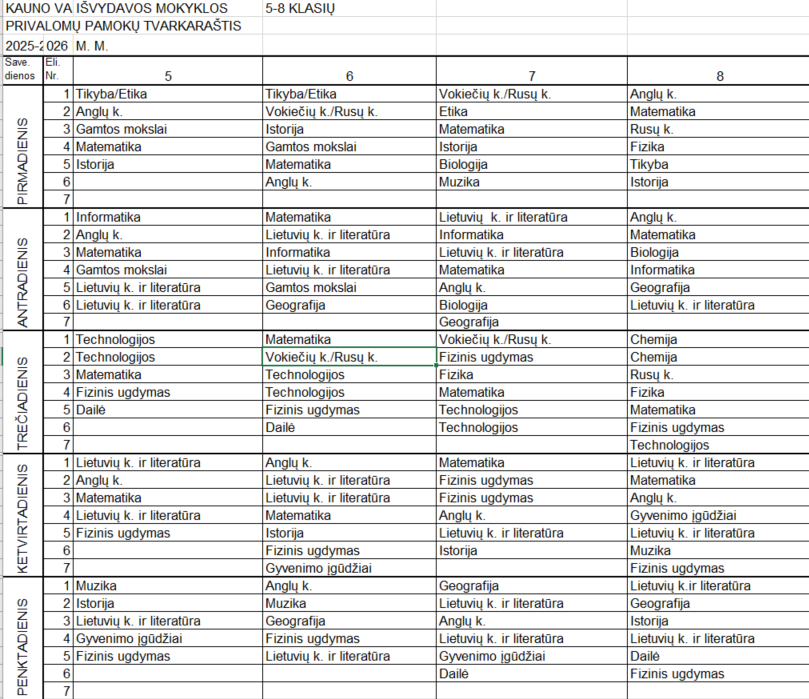 2025 – 2026 m. m. 5-8 klasių pamokų tvarkaraštis